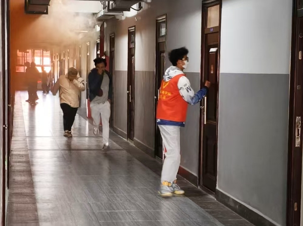 与此同时,为模拟真实火场应急疏散场景,一场精心组织的消防疏散逃生演练在17栋学生公寓同步进行。演练模拟宿舍内突发火情,楼内学生在宿管人员和志愿者的引导下,用湿毛巾捂住口鼻,沿着预定疏散路线,快速、有序地撤离至安全地带。整个演练过程紧张有序,达到了预期效果。